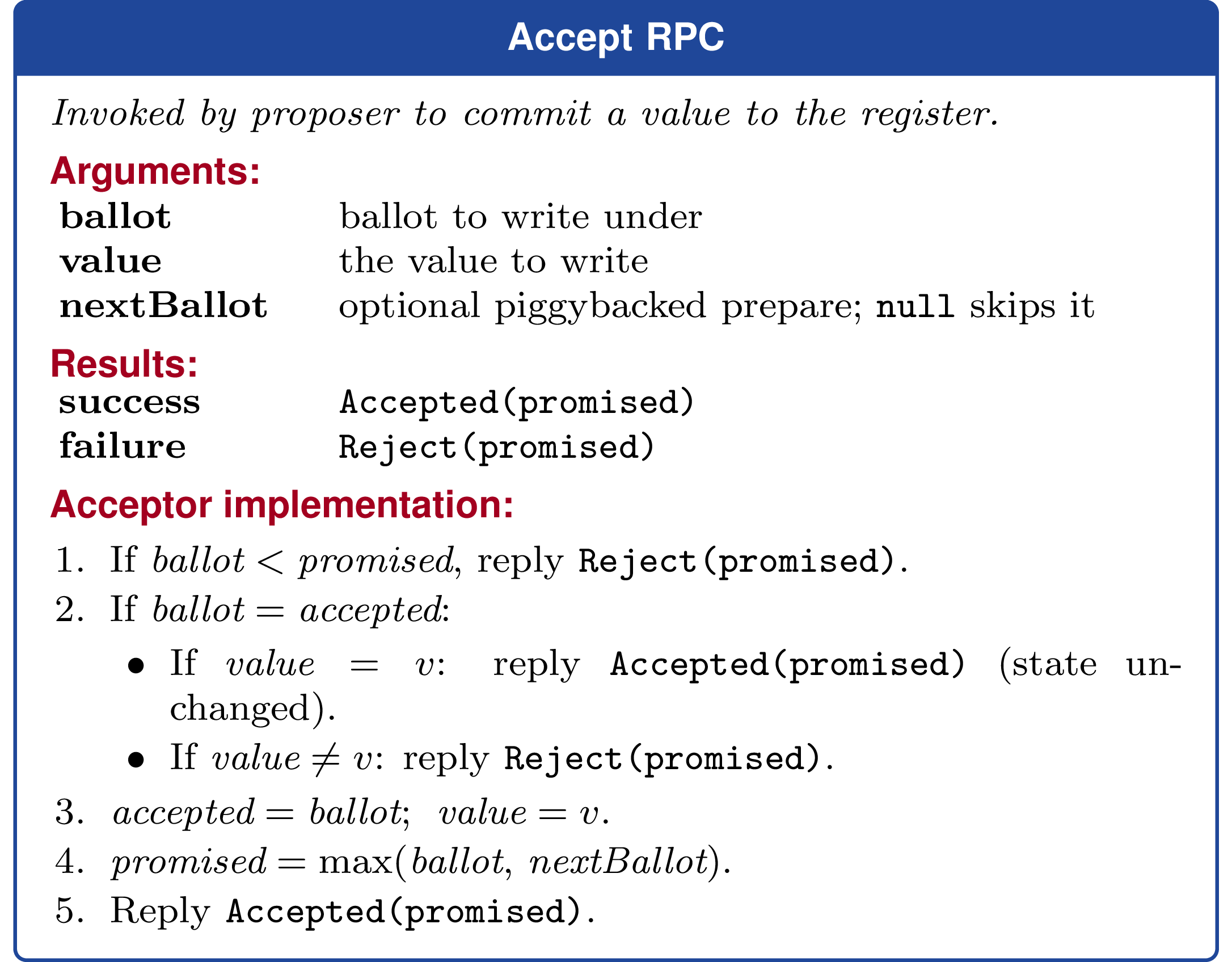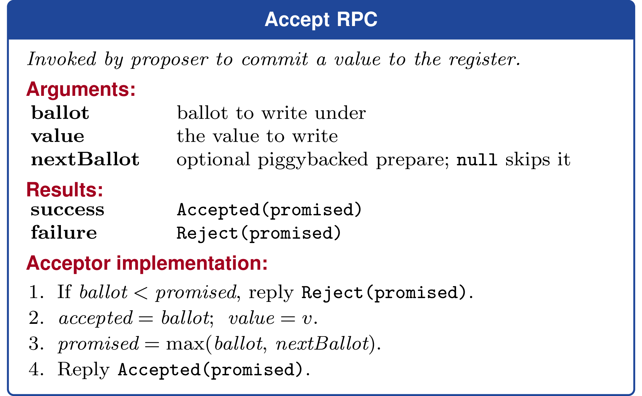function onAccept(b, v, next): maxBallot := max(promisedBallot, acceptedBallot) if b < maxBallot: reply reject(maxBallot) return