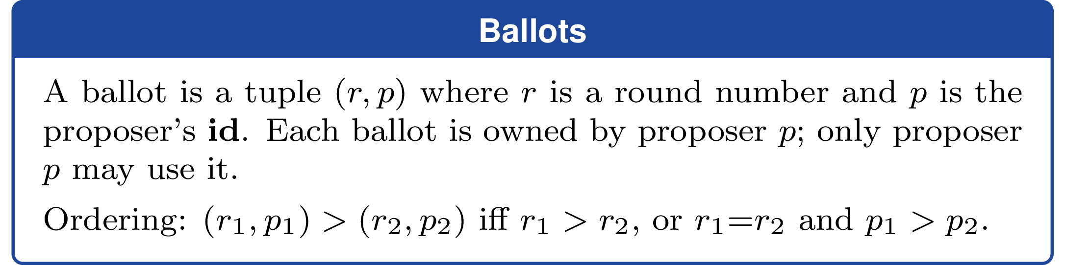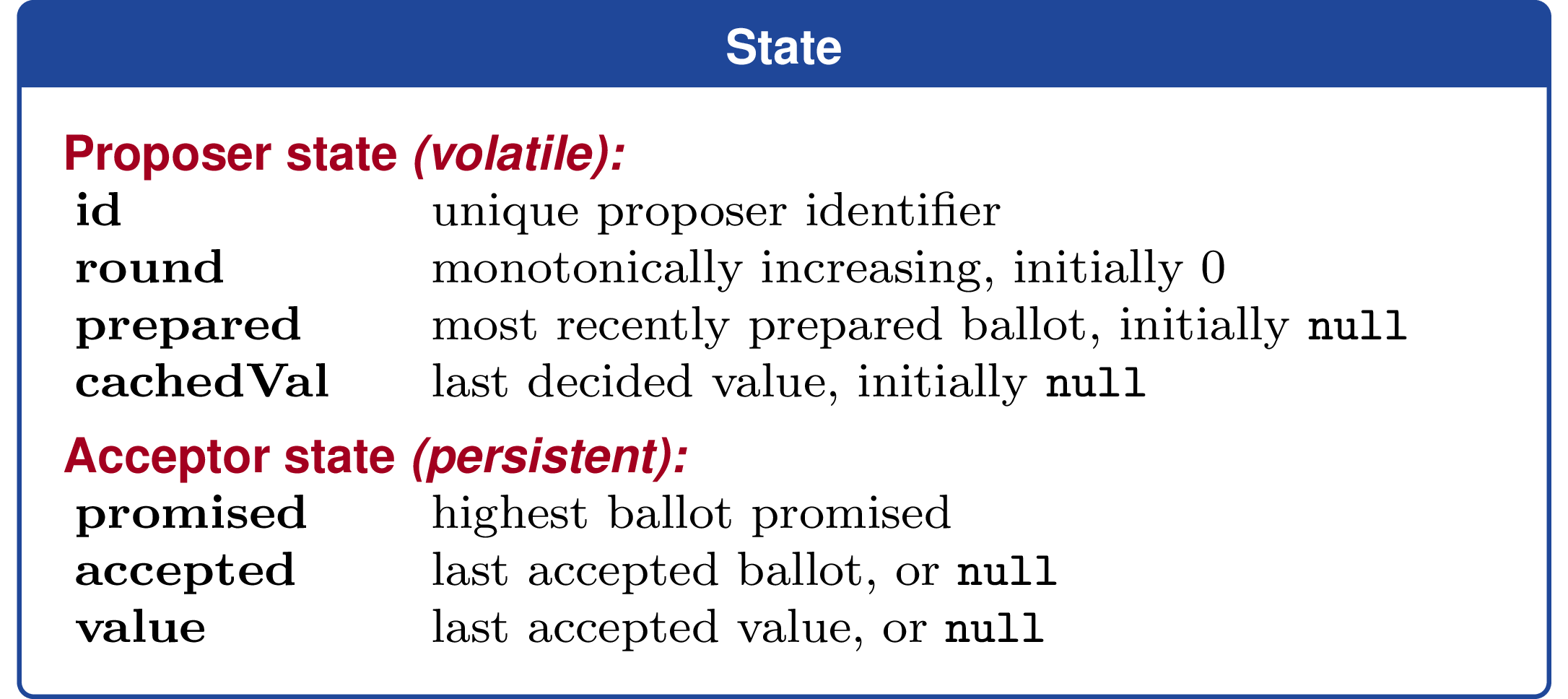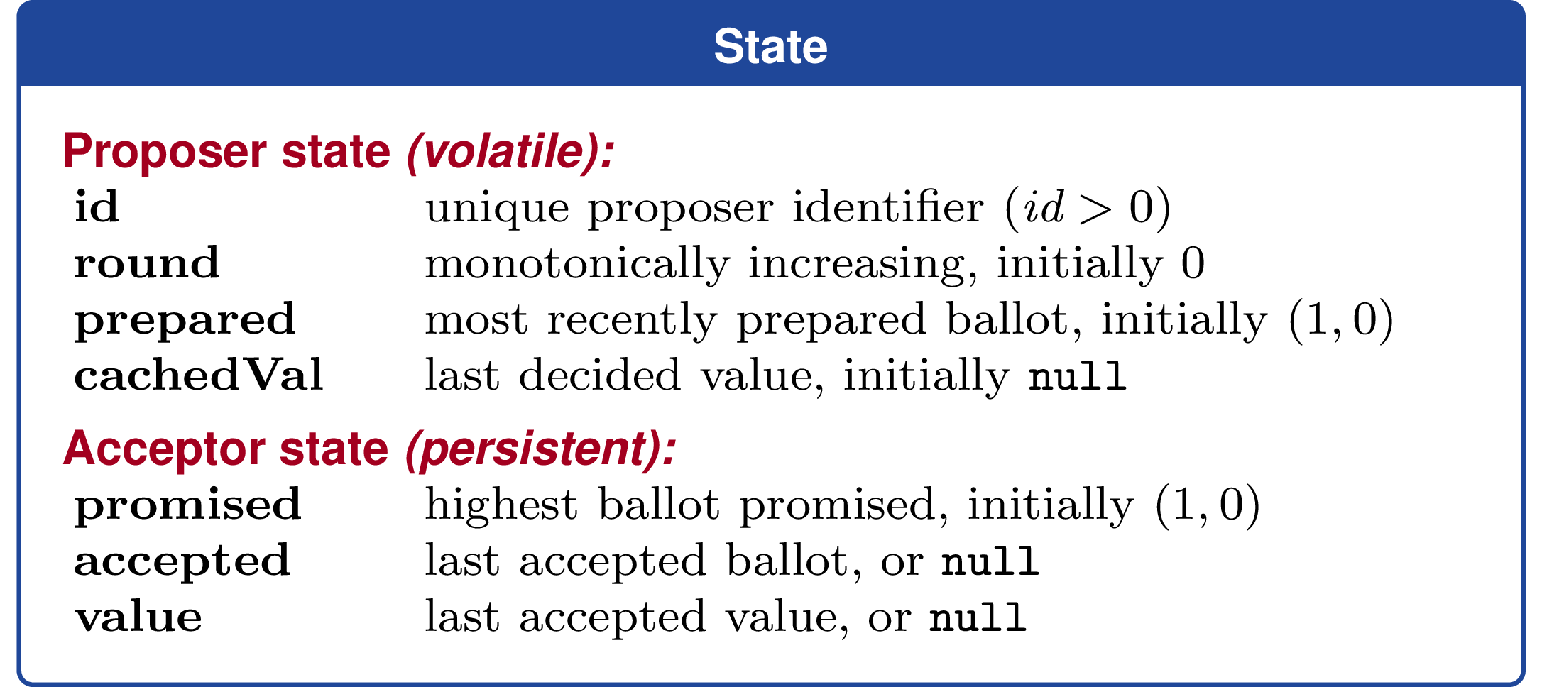 id: unique proposer identifierround: monotonically increasing, initially 0prepared: most recently prepared ballot, initiallynullcachedVal: last decided value, initiallynull