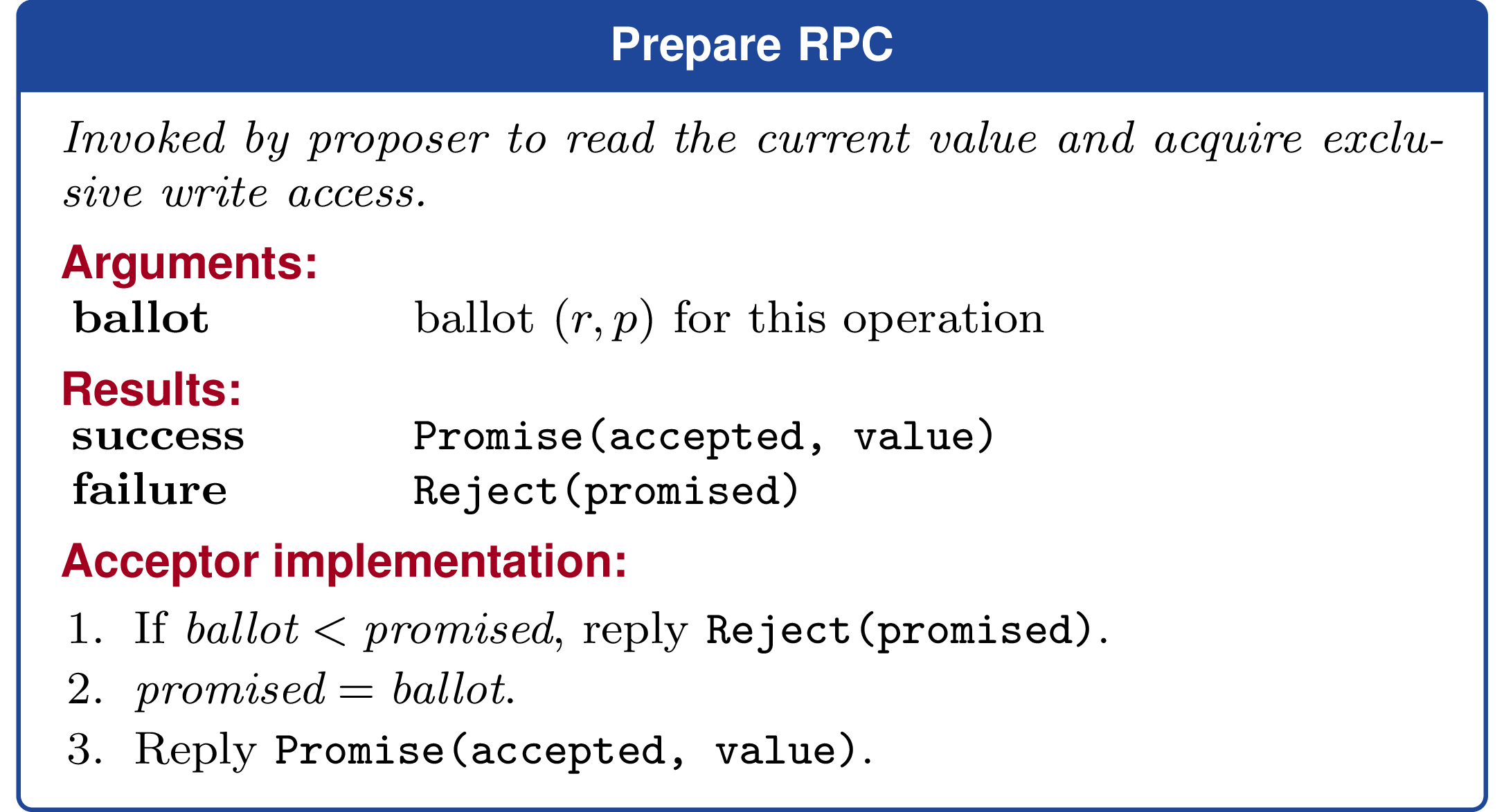 prepareresponse returns(acceptedBallot, acceptedValue, maxBallot) prepare(b)succeeds at an acceptor exactly when the response reportsmaxBallot = b