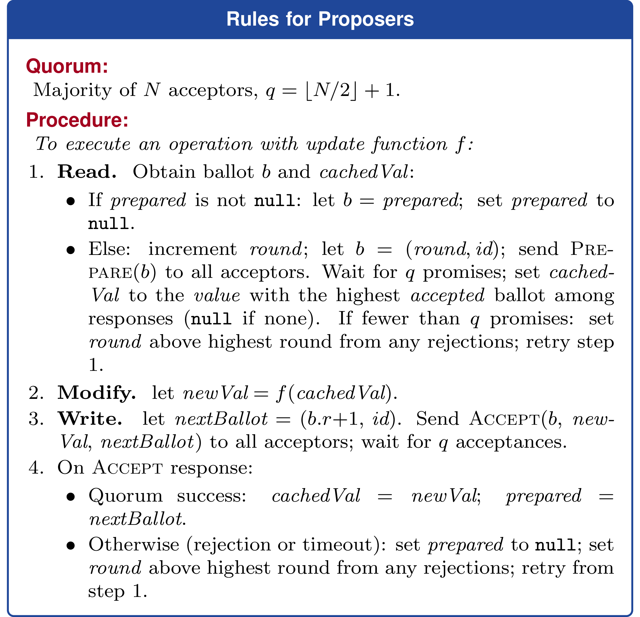 responses := collect Accept(b, newValue, next) responses if accepts in responses reach acceptQuorumFor(b): return newValue