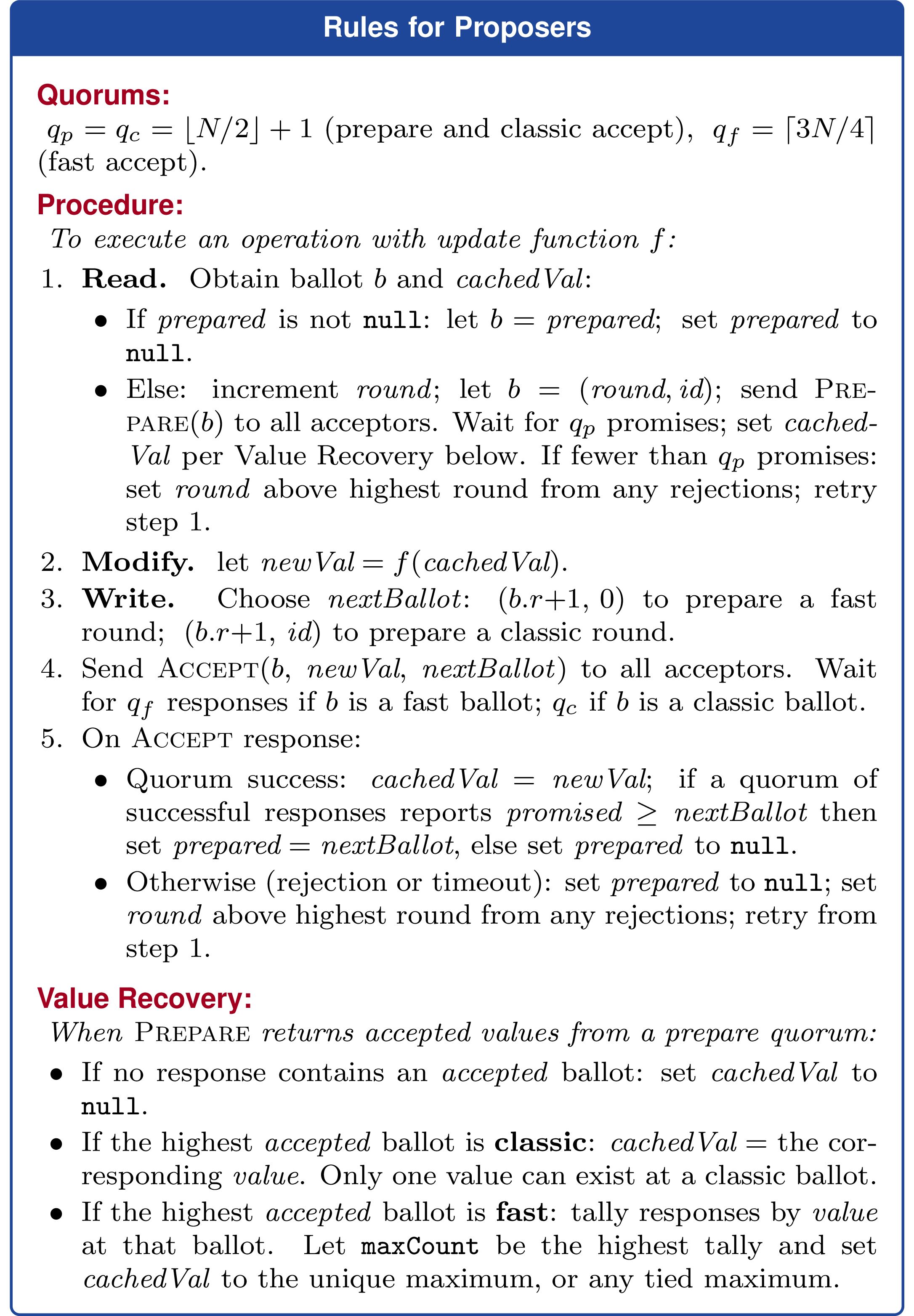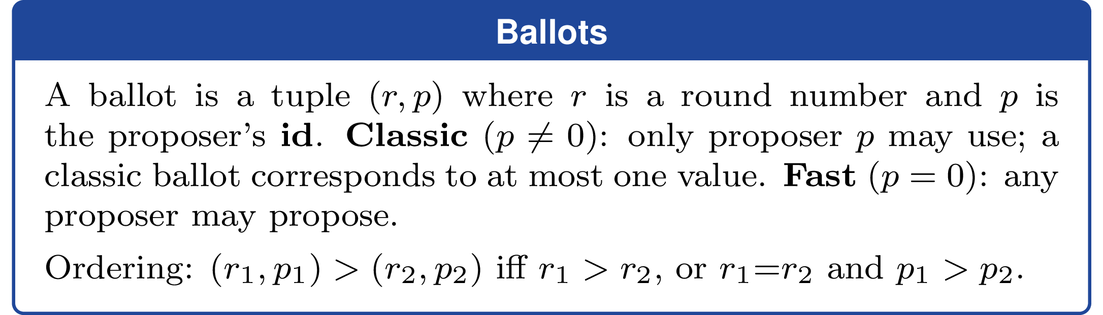 (round, proposerId), whereproposerId = 0denotes the shared fast ballot for that round prepareQuorum = classicQuorum = floor(N / 2) + 1fastQuorum = ceil(3N / 4)acceptQuorumFor(ballot) = fastQuorumfor fast ballots andclassicQuorumfor classic ballots- every